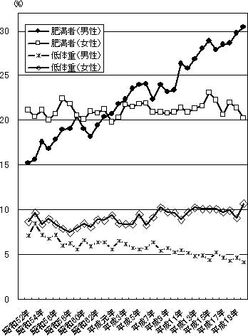 ●肥満とやせの状況の推移 (20歳以上)〔 (1)20年前(昭和62年) ・ (2)10年前(平成9年) ・ (3)平成19年 〕