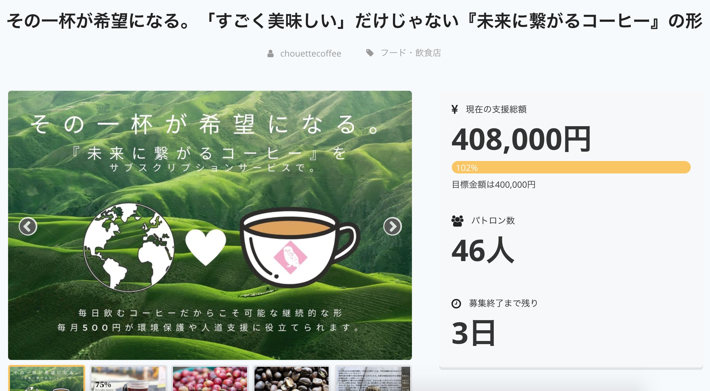 2020/03/22 16:47目標金額達成「その一杯が希望になる。「すごく美味しい」だけじゃない『未来に繋がるコーヒー』の形」プロジェクトオーナーのchouettecoffeeです。プロジェクトの目標金額を達成したので、ご報告させていただきます。皆様のご支援、ご協力によりプロジェクトが成功しましたこと、感謝申し上げます。現在の支援総額:408000パトロン数:46※詳細はこちらからご覧いただけます。https://camp-fire.jp/projects/view/227368プロジェクト終了後、パトロンの皆様へ順次リターンのご対応をさせていただきます。改めて、ご支援いただきまして誠にありがとうございます。プロジェクトの達成は、あくまでもサービスが開始しただけに過ぎません。この活動が、さらに多くの方々に受け入れられたくさんの寄付金へと変えていけるように尽力いたします。プロジェクトは、24日まであります。ご支援まだまだ募集していますので、どうぞよろしくお願い致します。 もっと見る残り7日。あと50000円。