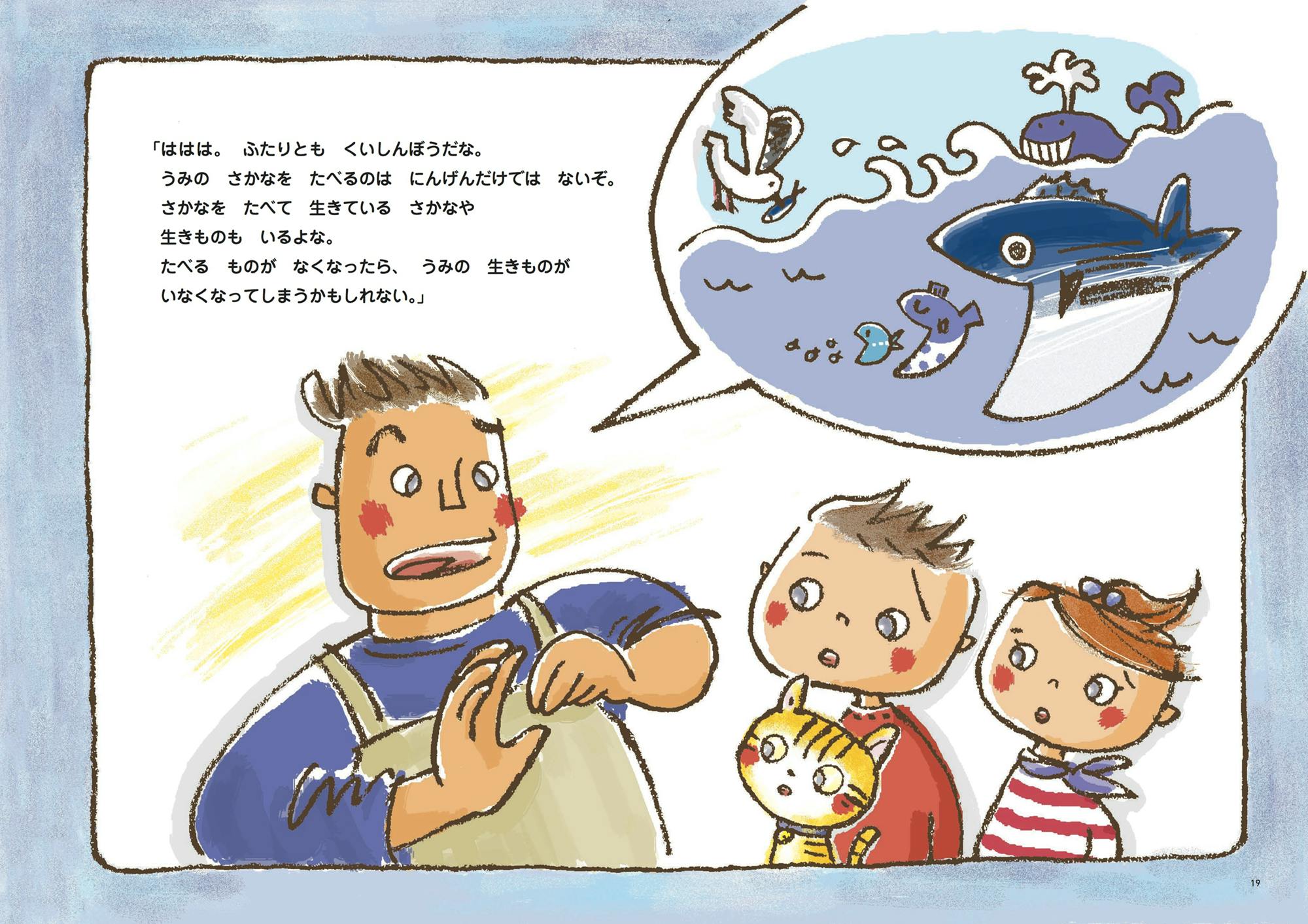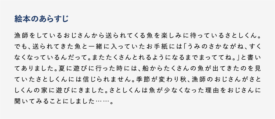 大人から子どもまで、たくさんの人に海や魚の現状を知ってもらいたくて作った絵本です。