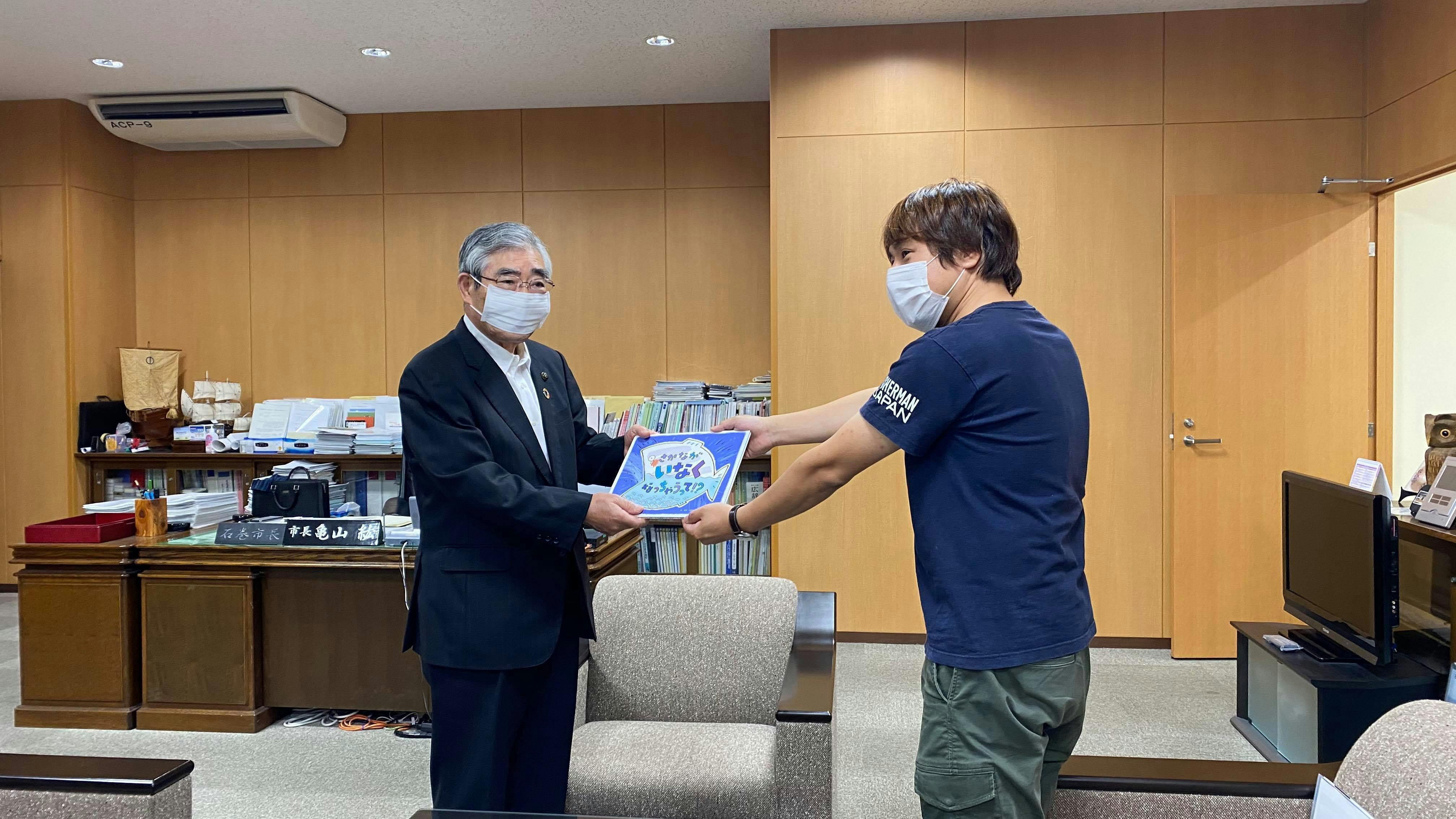 2020/06/25 19:00みなさまのご支援をいただき完成した絵本「さかなが いなくなっちゃうって!?」を全国の子どもたちにお届けする企画の第一弾として、石巻市へ50冊寄贈させてもらいました。これから市内全ての保育所・幼稚園に行き渡る予定です。見本を手にした亀山市長からは「子どもたちに読み聞かせるのにちょうどいい内容ですね。魚の街・石巻の子どもたちが、地元で捕れる魚を大切においしく食べることから始める。そのきっかけになるのではないか」とコメントをもらいました。コロナウイルス感染拡大防止措置で休園中のため、寄贈時期が遅れてしましたが、無事にお届けすることができました。石巻市に続き、全国各地の施設へもお届けの準備を進めています。 もっと見る