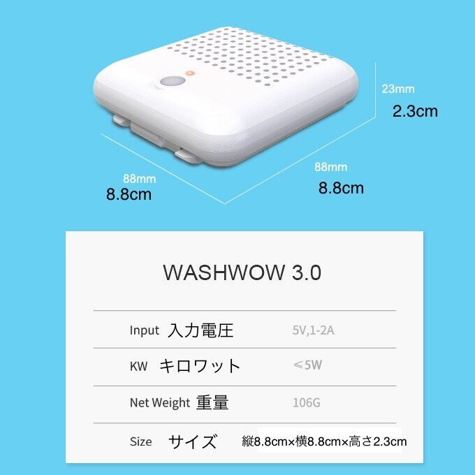 WASHWOW3.0汚れ除去のメカニズムWASHWOW 3.0は水の電気分解の仕組みにより発生する活性酸素の力で衣類の汚れを分解してくれます。製品内部は正・負の電極を生み出す貴金属でコーティングされており、水と作用して発生するOH, O, O2, O3, On, HnOnが衣類の汚れを水と二酸化炭素などに分解してくれます。次亜塩素酸には細菌やほこりダニを衣類に寄せ付けない抗菌効果があります。