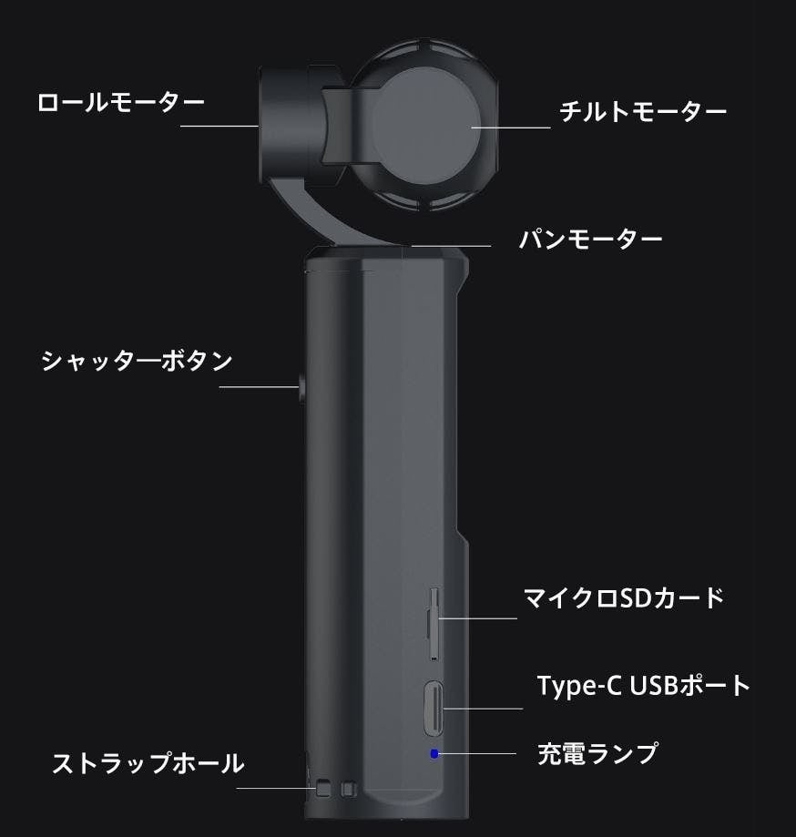ジンバルはジャイロスコープと同じ構造でチルト(垂直方向)、パン(水平方向)、ロール(正面左右45度回転)と3つの軸でカメラがセンサーで被写体を追いかけるのでピントを補正し続けブレない動画撮影が可能です。