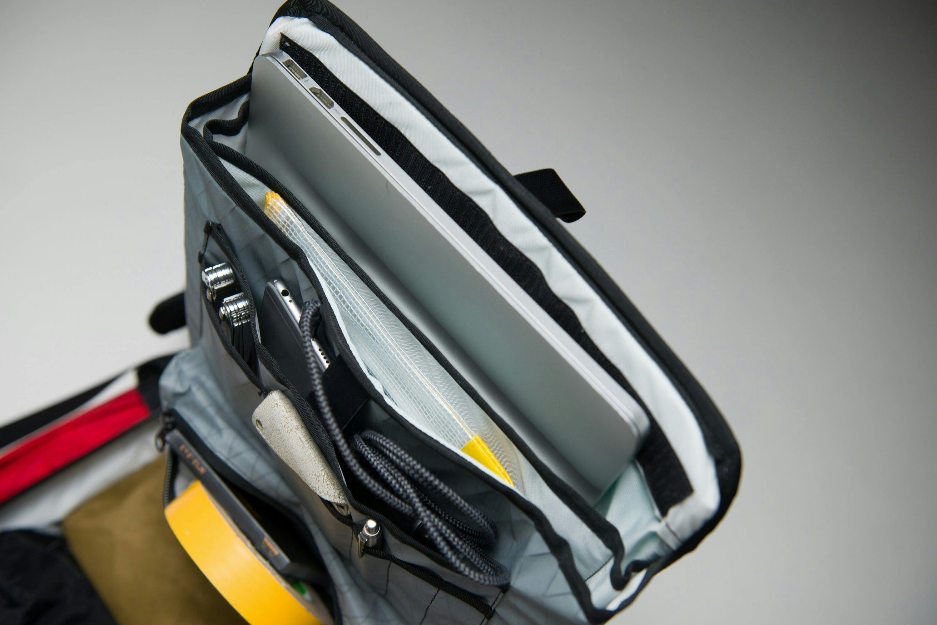 - ③荷物をどんどん入れられる寸胴型リュックながら、背面からPCを取り出せるチャックを作ることで、メイン開口部を開かずPCがすぐに取り出せるむちゃくちゃ便利な開口口を用意。