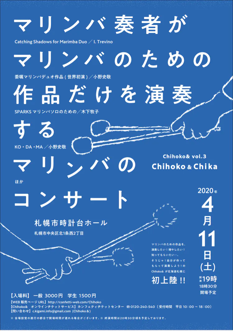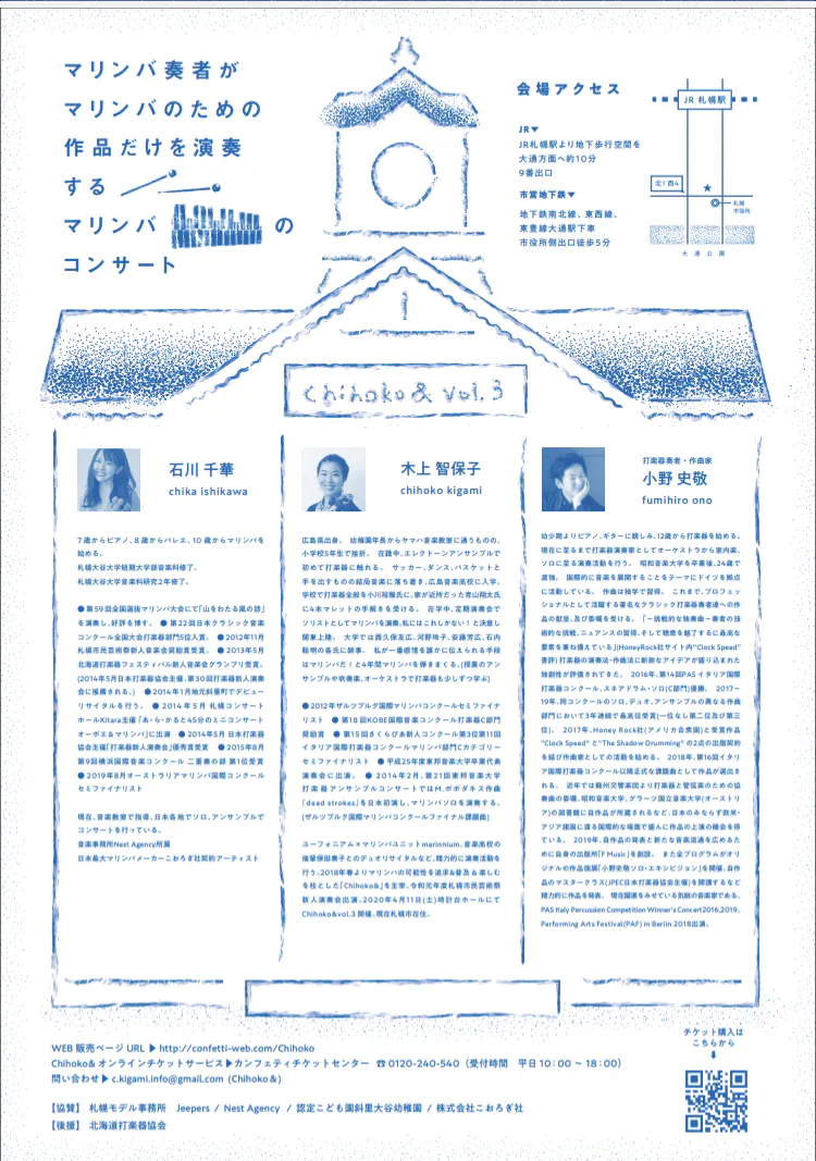 皆様はじめまして!マリンバ弾きの木上智保子と申します。マリンバのための作品を、演奏したい!増やしたい!知ってもらいたい…。そうじゃ!自分が作ってもらって演奏しよう!と2018年に始めたコンサートシリーズ「Chihoko&」が東京を飛び出し初めて北海道札幌で開催することになりました!
