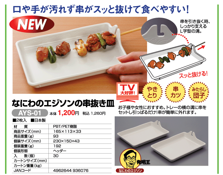 2020/03/31 05:00弊社の名誉顧問である なにわのエジソン 木原健次さんhttp://www.smile-asahi.co.jp/hm-kihara.html 全国でも有名な珍発明家として、各種TVにひっぱりだこの木原さんです月曜から夜更かし の録画動画がyoutube で24万回再生https://www.youtube.com/watch?v=ed2JLIC03zk&feature=emb_logo その木原さんとのコラボレーション商品が今回取り上げられる「くし抜き皿」です。焼き鳥を食べるときに箸で取ろうとして、肉がどこかへ飛んで行ってしまったという苦い思い出を、商品として見事に昇華させたものが本品です。商品詳細はこちらです http://www.smile-asahi.co.jp/hm-wadaisyouhin-2.html是非、ご視聴ください。 もっと見る