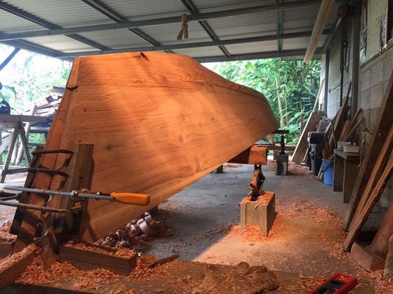 サバニを造っていただく吉田サバニ造船さんは、石垣の白保に住む船大工の新城氏に伝統木造漁船のサバニの本ハギ技法を学び、鉄釘を使わず、木と木を繋ぐのもフンドウや竹釘を使います。