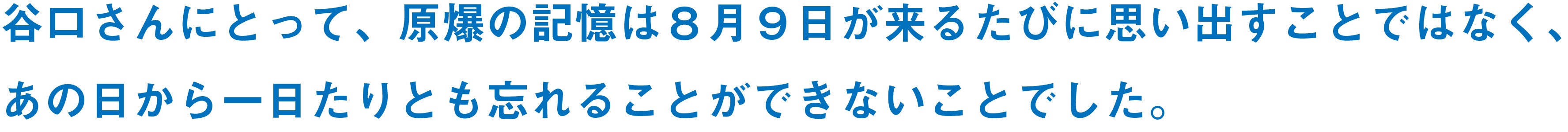 想像を絶する苦しみを抱え、さらに自らが傷つくことがわかっていても、もう二度と自分と同じような経験を他の誰にもさせたくないから証言を続ける。そんな谷口さんの姿に人間の尊厳を感じ、同時に「それだけ核兵器が恐ろしいのか」と、恐怖を感じます。