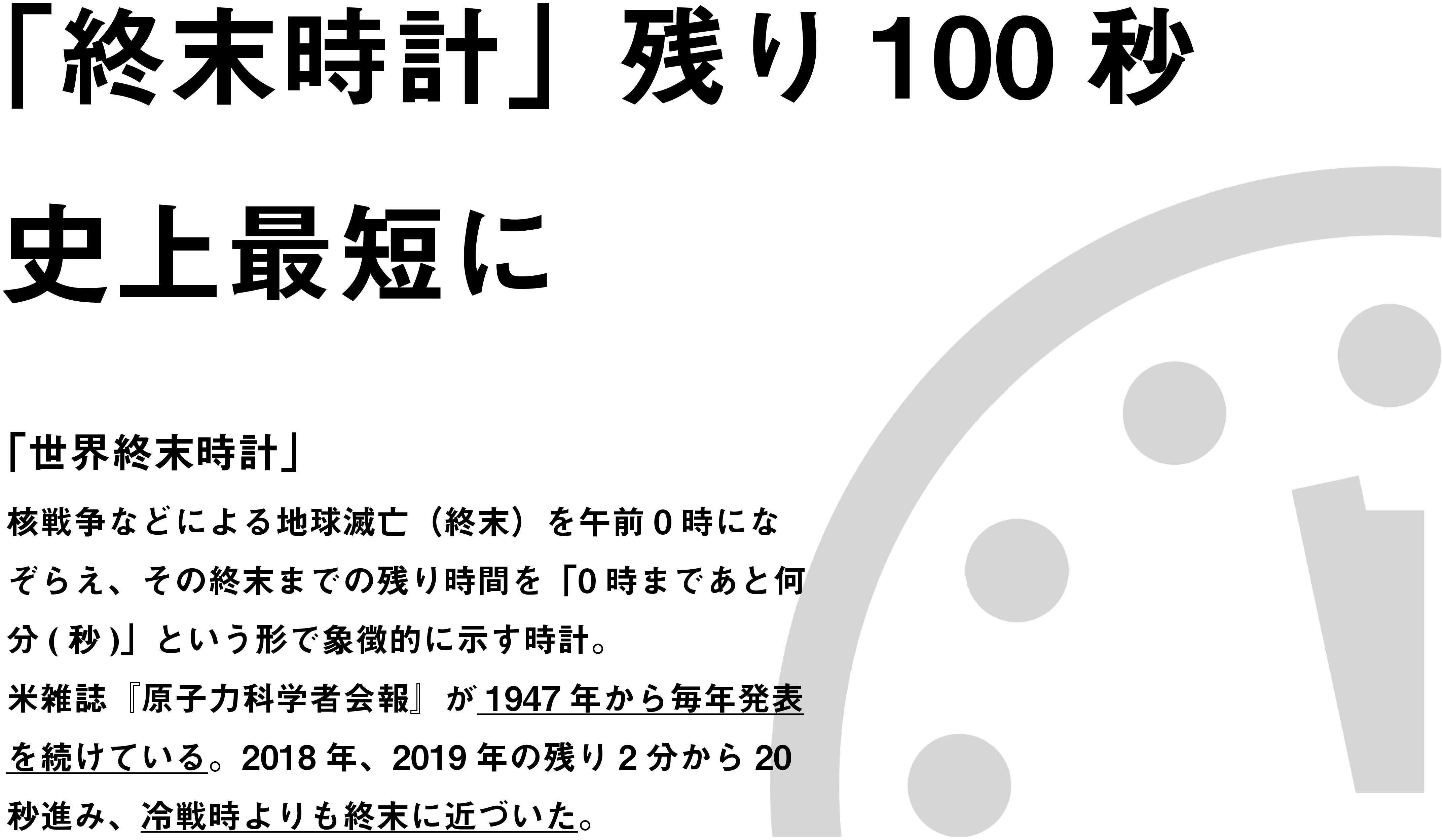 現在、米国によるイラン核合意からの離脱、北朝鮮非核化交渉の停滞、米ロの中距離核戦力(INF)全廃条約の失効などを理由に「第二次世界大戦後、最も核兵器使用のリスクが高まっている」ことをご存知ですか?