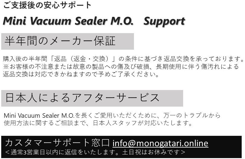 2020/07/01 13:03ご支援いただきました皆さまへLEDライト付きミニ真空パック器【Mini Light Sealer M.O.】にご支援いただきまして誠にありがとうございます。大変お待たせして申し訳ございません。本日、製品の配送を完了いたしました。製品がお手元に届きますまで今しばらくお待ちくださいませ。『Mini Light Sealer M.O.』が皆さまのお役に立てますことを願っております。製品に関するお問い合わせなどございましたら下記までご連絡くださいませ。===================MONOGATARIお客様窓口Mail: info@monogatari-japan.com <営業時間> 平日:10:00~18:00 土日祝:お休み===================今後とも弊社の製品をどうぞよろしくお願いいたします。MONOGATARI もっと見る【ご案内】配送スケジュールについて②
