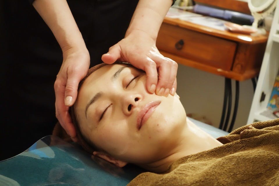 顔、首、肩、デコルテ、背中 、頭骸骨コルギの施術。