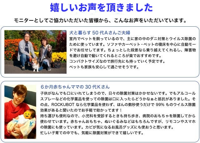 2021/07/01 22:00皆様、ご無沙汰しております。除菌ロボットROCKUBOT、おかげさまで発売から1年が過ぎました。皆様へお届けするときはなかなか生産が追い付かずに、お届けまでかなりお待たせしてしまいましたが、1年経過しようやく生産体制が整い、安定して商品をお届けできるようになりましたので、よりロックボット商品を広めるべく再度プロジェクトの実施を決めました。除菌ロボROCKUBOT→https://camp-fire.jp/projects/view/436088 空間除菌ができるROCKUBOTAIr→https://camp-fire.jp/projects/view/439463 姉妹品の空間除菌ができるROCKUBOTAirも同時に開催中でございます。すでにプロジェクトは本日より開始しており、7月30日までの期間限定・数量限定です。正直、これだけお安い価格で販売できるのはこれで最後の機会になると思います。この1年で、商品に対する更なる検証を重ね、ダニに対する増殖抑制効果・新型コロナウイルスに対する効果が認められております。また画像のように、お客様から「原因不明の皮膚疾患が改善された」との嬉しいお声も頂いております。一人でも多くの方へぜひROCKUBOT商品を広めるべく、この1か月間頑張っていきたいと思います。よければ最新の検証結果なども載せておりますので、のぞいて頂ければ幸いでございます。梅雨の季節、お布団が干せなくてもROCKUBOTでお布団ケアをして頂けると気持ちよく寝ることができますので、最近使ってないな~という方もぜひお布団・ベッドで使ってみてくださいませ。どうしてもベッドの形状で落ちてしまうこともあるかと思います(特に端が柔らかめのベッド)その場合、シーツで囲い込むようにして、シーツとベッドの間を走らせるとうまくいく、というお声を頂いております。もしくはベッドの端に縁になるようなものを設置して頂くことも解決策の一つです。何か不具合などございましたら、お気軽にお問い合わせください。今後とも何卒よろしくお願い申し上げます。株式会社EGLOKINAWA 物販プロジェクトチーム一同 もっと見る