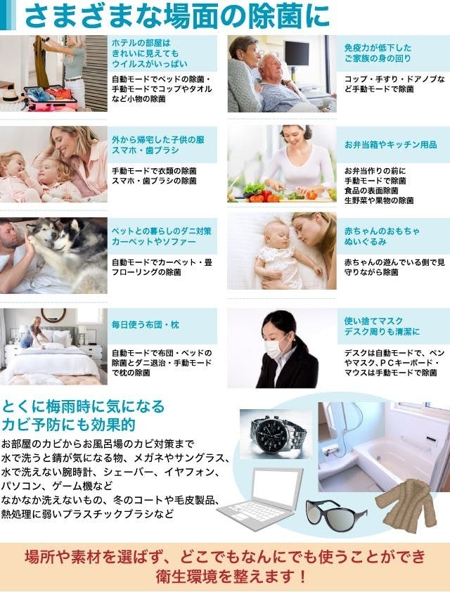 枕カバー、衣類、スマホ、キーボード、腕時計、キッチン用品、照明スイッチ、眼鏡、バスルームの備品、おもちゃ、テレビのリモコンなどあらゆる表面を除菌することができます。