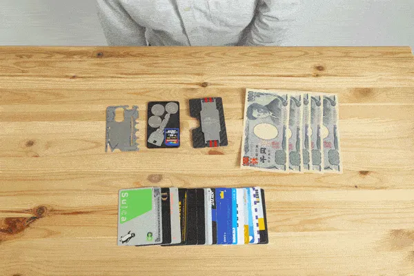 普段よく使うカード4枚を入れてみましたが、本当に薄く、ズボンのポケットに入れても服のシルエットを崩さないこところがすごく気に入りました。