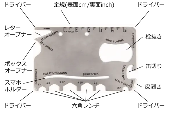 男心をくすぐる便利なマルチツールがつきます。クレジットカードサイズで、KNIGGE(クニッゲ)にぴったり収ります。これさえあれば簡易工具を持ち歩く必要はありません。