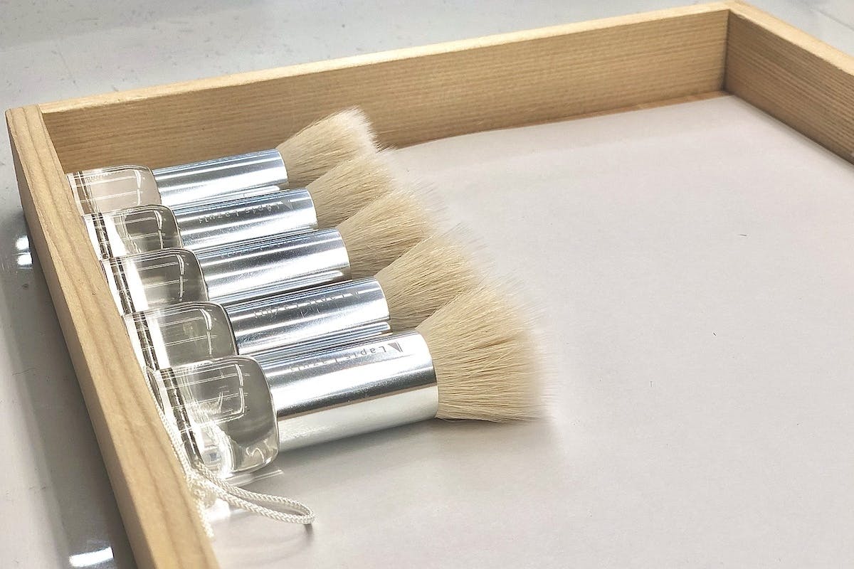 洗顔ネット要らずでヌルヌルとした泡を作り出すLLモイストベールソープの良さを生かし、広島県の伝統工芸品「熊野筆」の老舗工場である竹宝堂様へご協力を仰ぎ、1年以上の月日を経てようやく生まれたラピスラズリだけのオリジナルアイテムが、このLLフェイスケアブラシです。