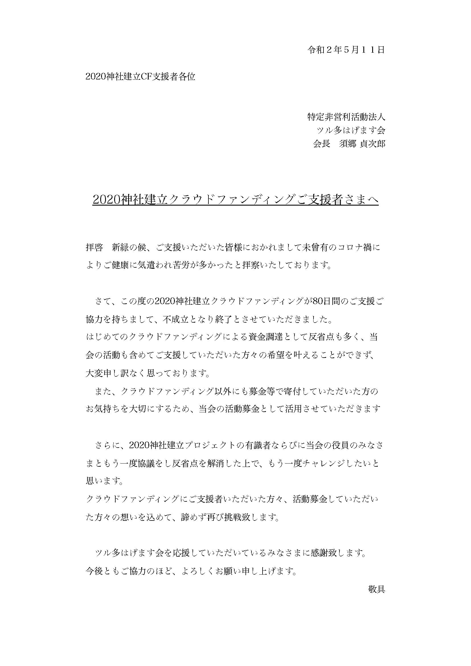 2020/05/12 00:002020神社建立クラウドファンディングご支援者さまへ新緑の候、ご支援いただいた皆様におかれまして未曾有のコロナ禍によりご健康に気遣われ苦労が多かったと拝察いたしております。さて、この度の2020神社建立クラウドファンディングが80日間のご支援ご協力を持ちまして、不成立となり終了とさせていただきました。はじめてのクラウドファンディングによる資金調達として反省点も多く、当会の活動も含めてご支援していただいた方々の希望を叶えることができず、大変申し訳なく思っております。また、クラウドファンディング以外にも募金等で寄付していただいた方のお気持ちを大切にするため、当会の活動募金として活用させていただきます。さらに、2020神社建立プロジェクトの有識者ならびに当会の役員のみなさまともう一度協議をし反省点を解消した上で、もう一度チャレンジしたいと思います。クラウドファンディングにご支援者いただいた方々、活動募金していただいた方々の想いを込めて、諦めず再び挑戦致します。ツル多はげます会を応援していただいているみなさまに感謝致します。今後ともご協力のほど、よろしくお願い申し上げます。特定非営利活動法人ツル多はげます会会長 須郷 貞次郎 もっと見る
