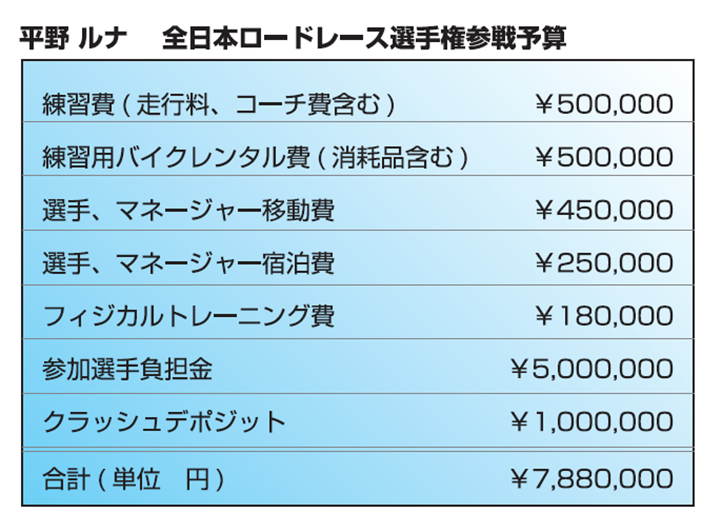 クラウドファンディングでは参加選手負担金を除く費用と海外遠征等に伴う渡航費・走行経費などを個人支援者様ならびに法人様にご支援いただきたく思っております。