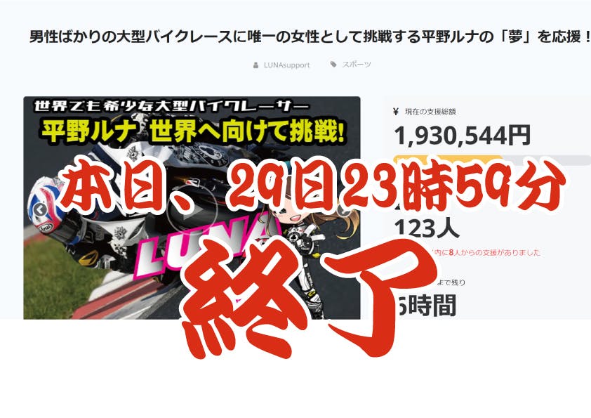 2020/04/29 18:55約60日間にわたり挑戦してきましたクラウドファンディングも本日29日をもって終了となります。コロナショックで皆さん本当に大変な中沢山のご支援を頂いたことに心より御礼申し上げます!実は本日6月末に開催予定だった「筑波ラウンド」も中止の発表があり、本当に何時になったら走れるのか。。。次の「菅生ラウンド」もどうなるのか全く不明な状況ですので、何時皆さんに元気に走りまわっている姿をお見せできるのか。。物凄く複雑な気持ちでいっぱいです。でも。「明けない夜は無い」という前向きな気持ちでしっかり準備を行っていきます!2020年仕様のマシンデコレーションも来月中旬には完成予定ですので何処かでお披露目させていただきます!気持ちで負けない!!!!頑張ります! もっと見る