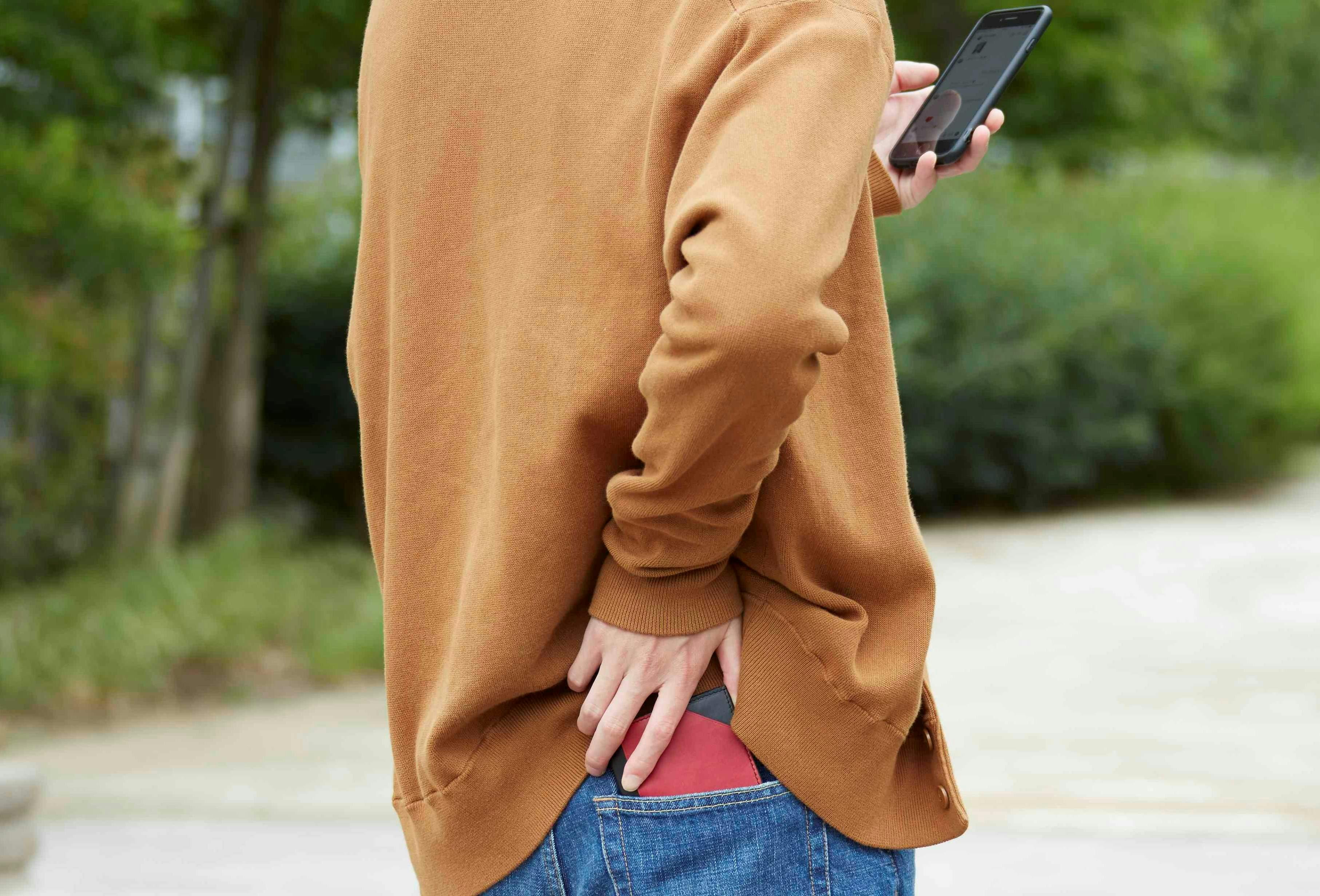 昔ながらの二つ折り財布(第1世代)は、カードやコインがかさばってポケットがパンパンに。