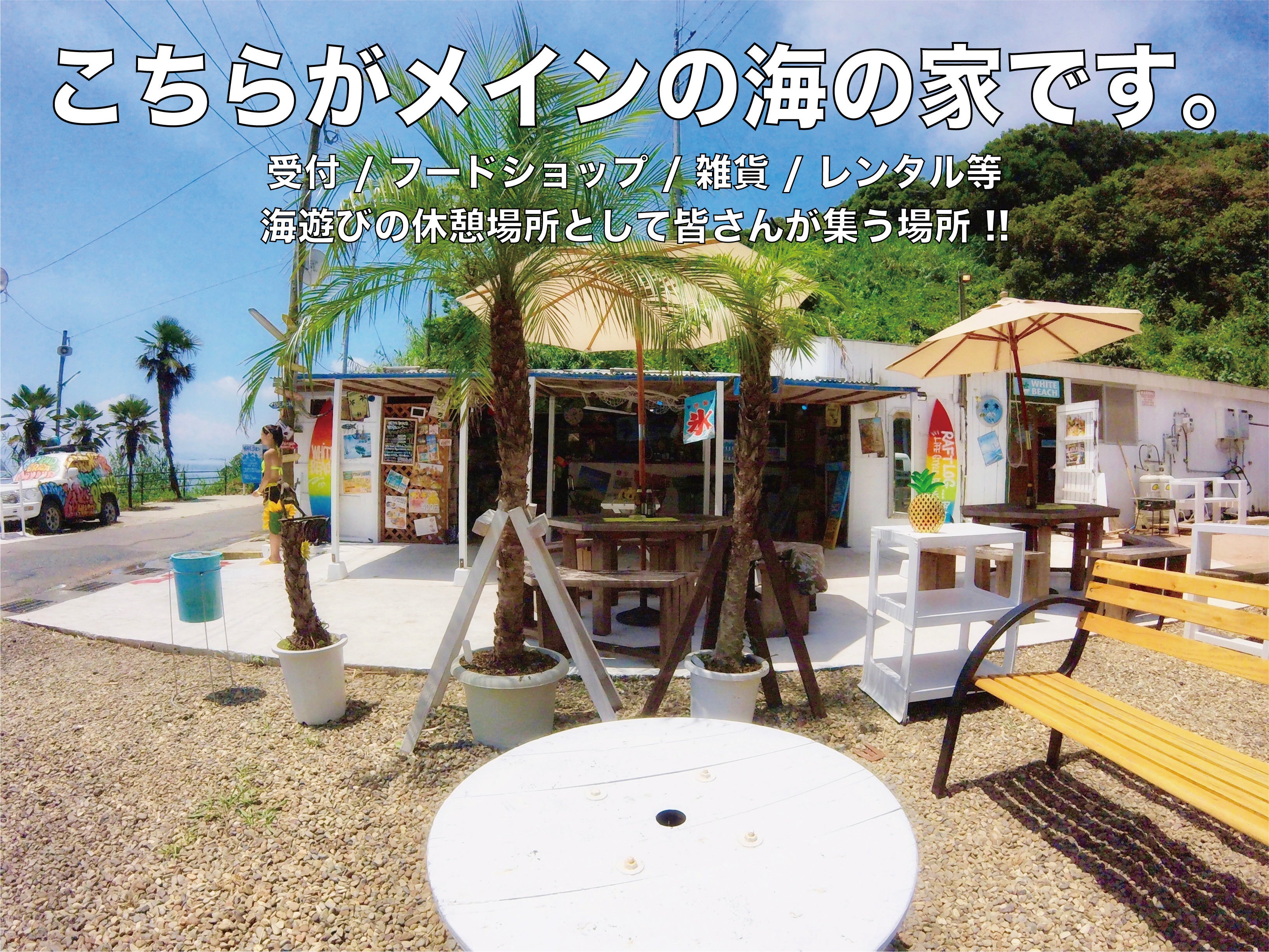 始めた当初はまだボロボロな木材家屋でしたが、時間をかけ自分なりに南国にあるような海の家へと改造していきました。まずはたくさんの人達に知ってもらえるようSNS、ポスター、フライヤー等で発信していき、来て頂いた人達が楽しんでもらえるよう常に気を配り努力してきました。結果、年々と来客者が増え、今では「夏はホワイトビーチ」なんて言われるまで成長することができました。
