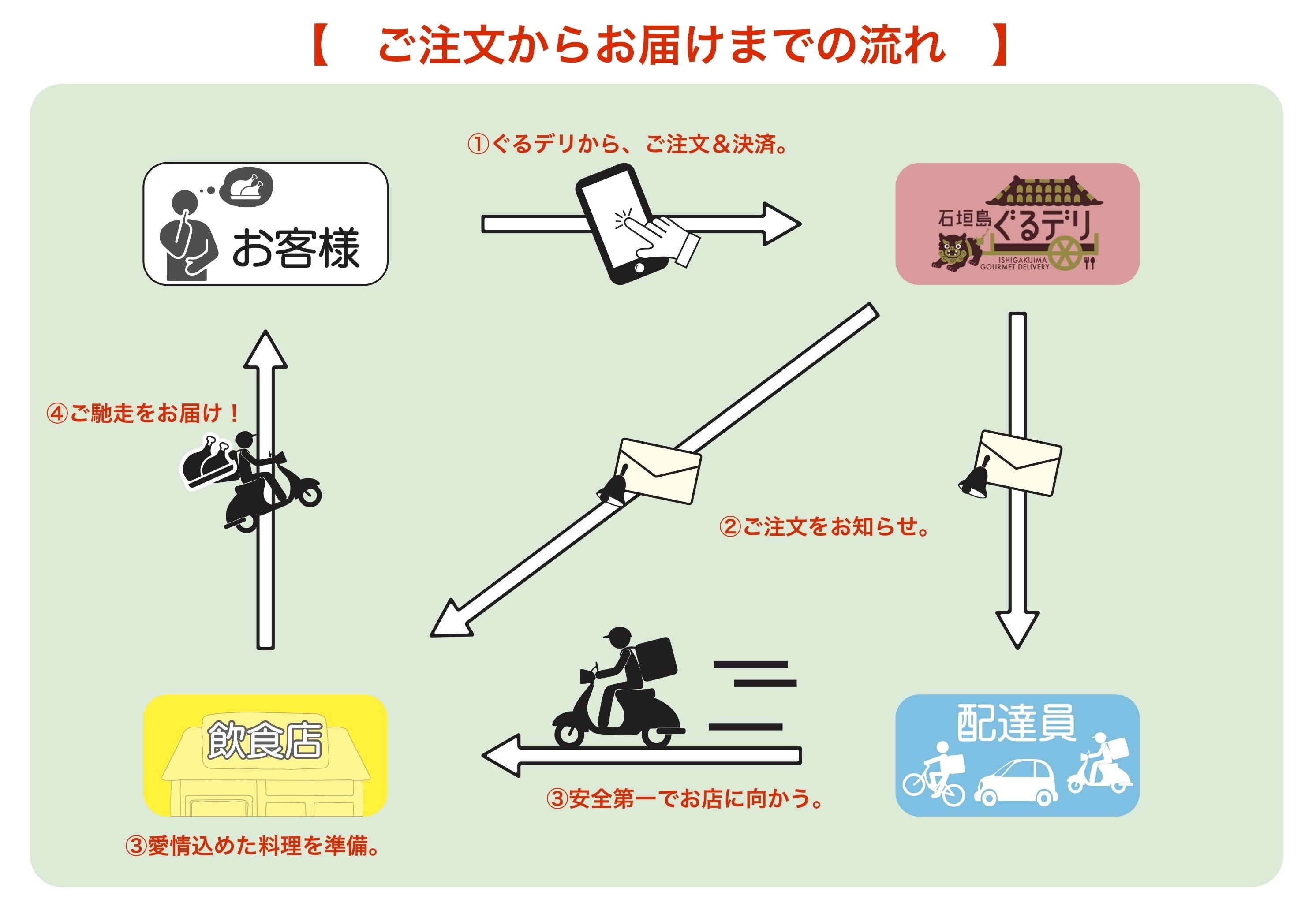 『石垣島ぐるデリ』は、家や職場に居ながら島内飲食店の料理デリバリーを注文できるwebサービス。飲食店は、お客様の注文情報を『石垣島ぐるデリ』から受け取り料理を用意。そのお料理を『石垣島ぐるデリ』の配達員が、お客様が指定した届け先までデリバリーします。