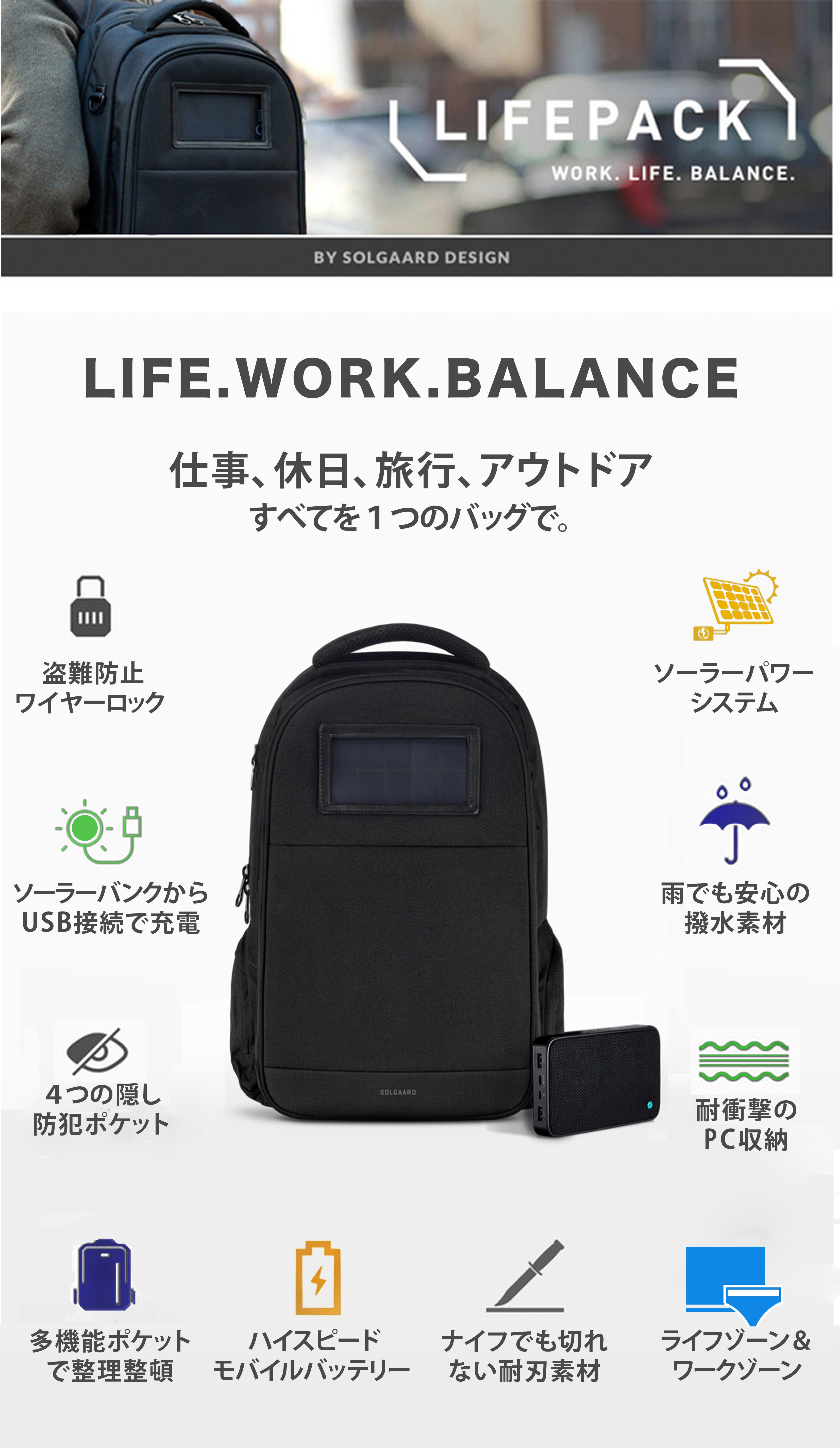 ソーラーバンクや防犯機能を持つLifePack2.0はトラベル・アウトドアでも重宝します。アドベンチャー好きにもぴったりのバックパックです。