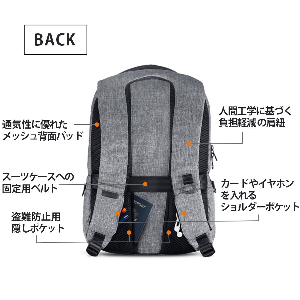 背面の隠しポケットは、優れた防犯性を持ち、パスポートや財布、鍵などの貴重品を入れるのに最適です。
