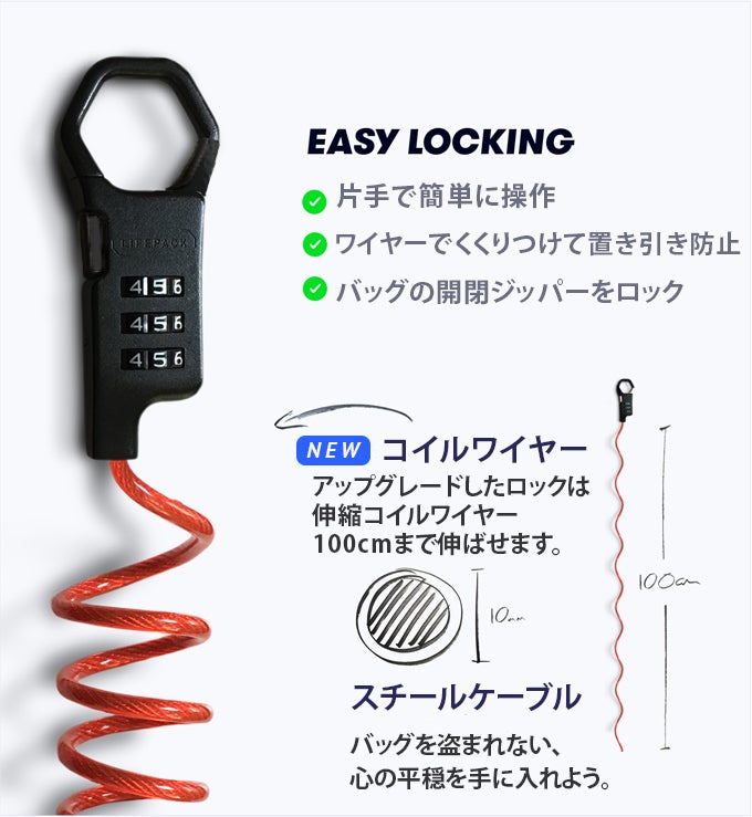 ロックも装備しているためカフェで仕事に集中している時、荷物を気にかける心配はありません。これがあれば、もうバックパックをトイレに持ち込まなくてもいいのです。