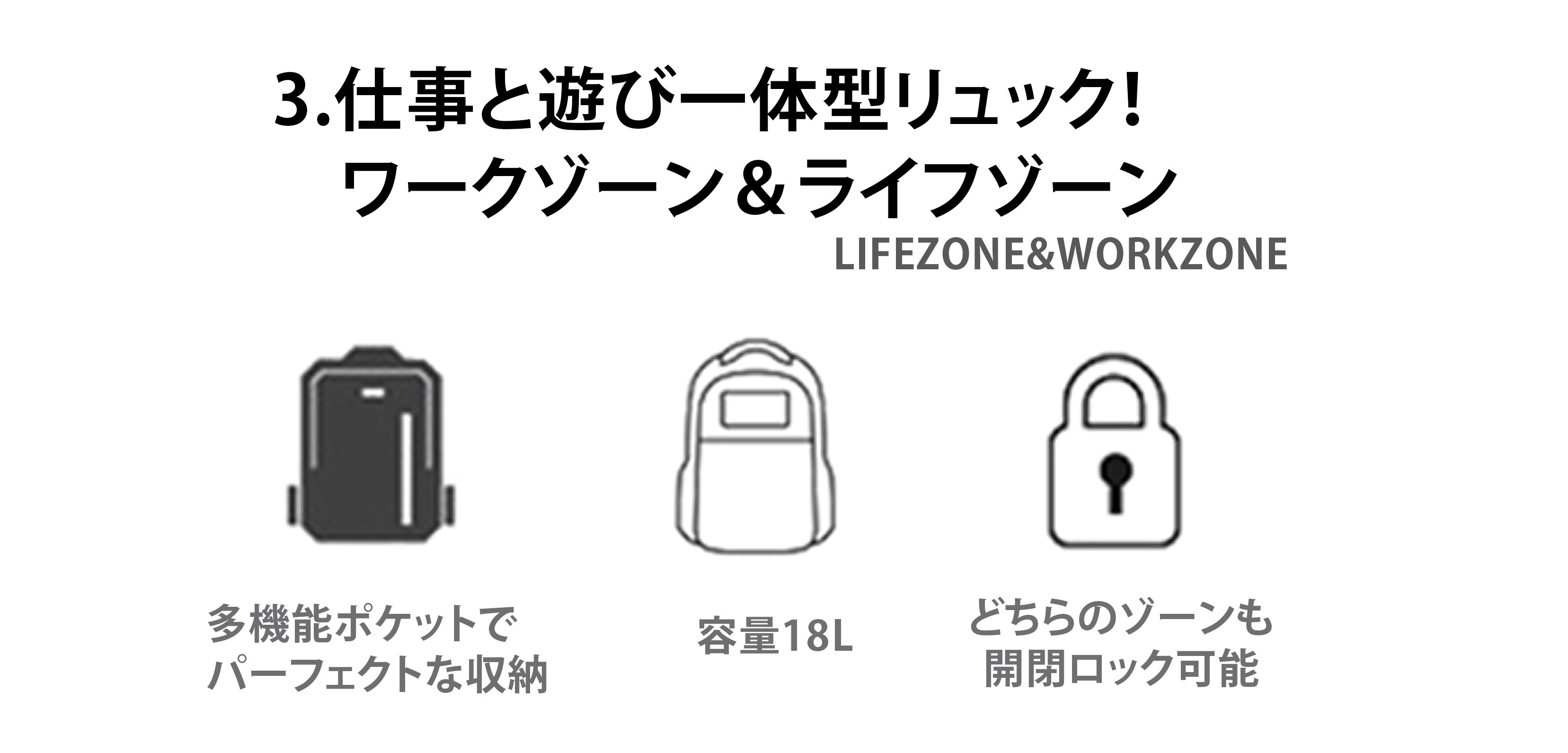 LIFEPACK2.0は、プライベートなものや着替えなどを収納するためのライフゾーンと、PCや書類など仕事に使うものを収納するワークゾーンに分かれていて、分離して整頓することができます。