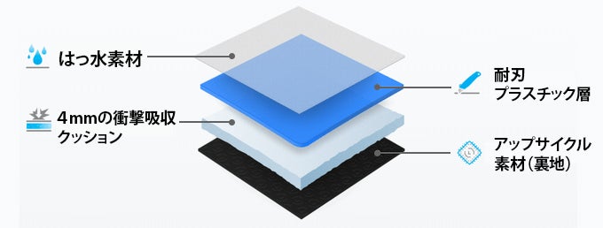 リュックの素材は4層構造になっています。水を弾き、耐刃でナイフで切っても破れません。