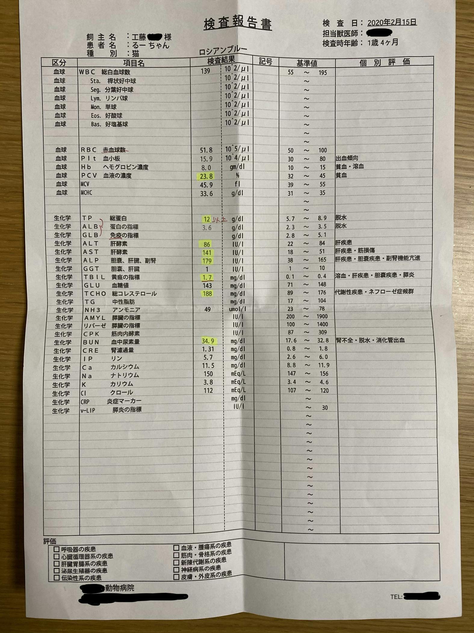 2月15日の再診時に、獣医さんより体重の減少を指摘され血液検査を行いました。