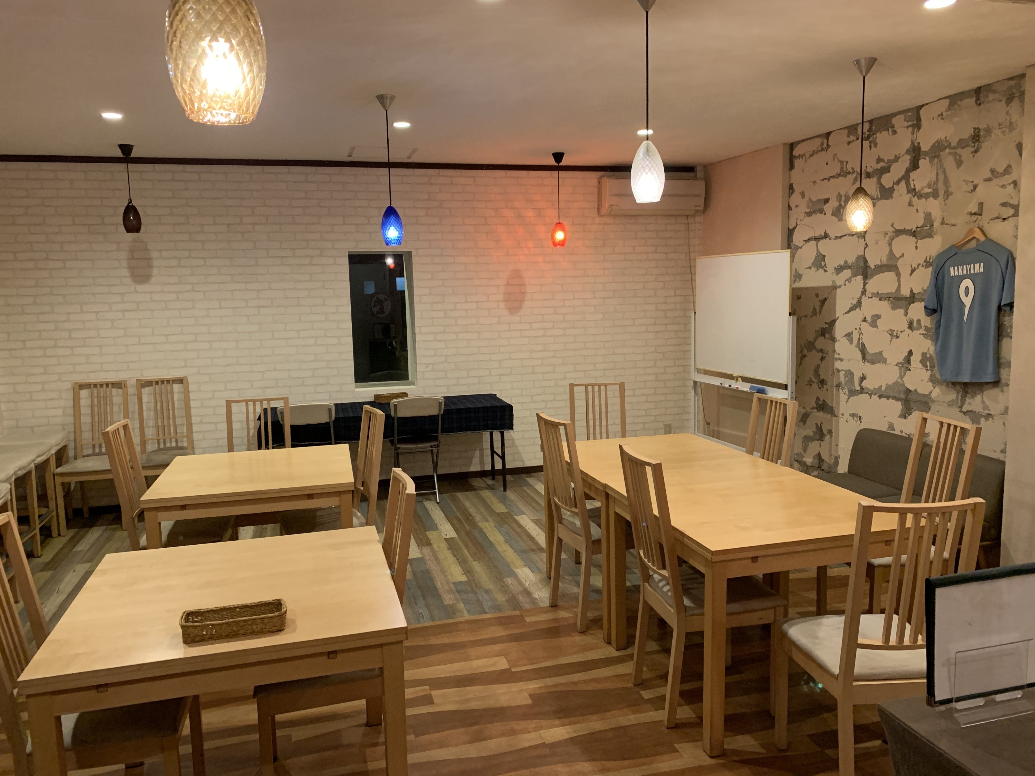 奥には大きなスペースを確保し、ここで教室やセミナー、ホーム戦後の食事会。アウェイ時のパブリックビューイングも行います。