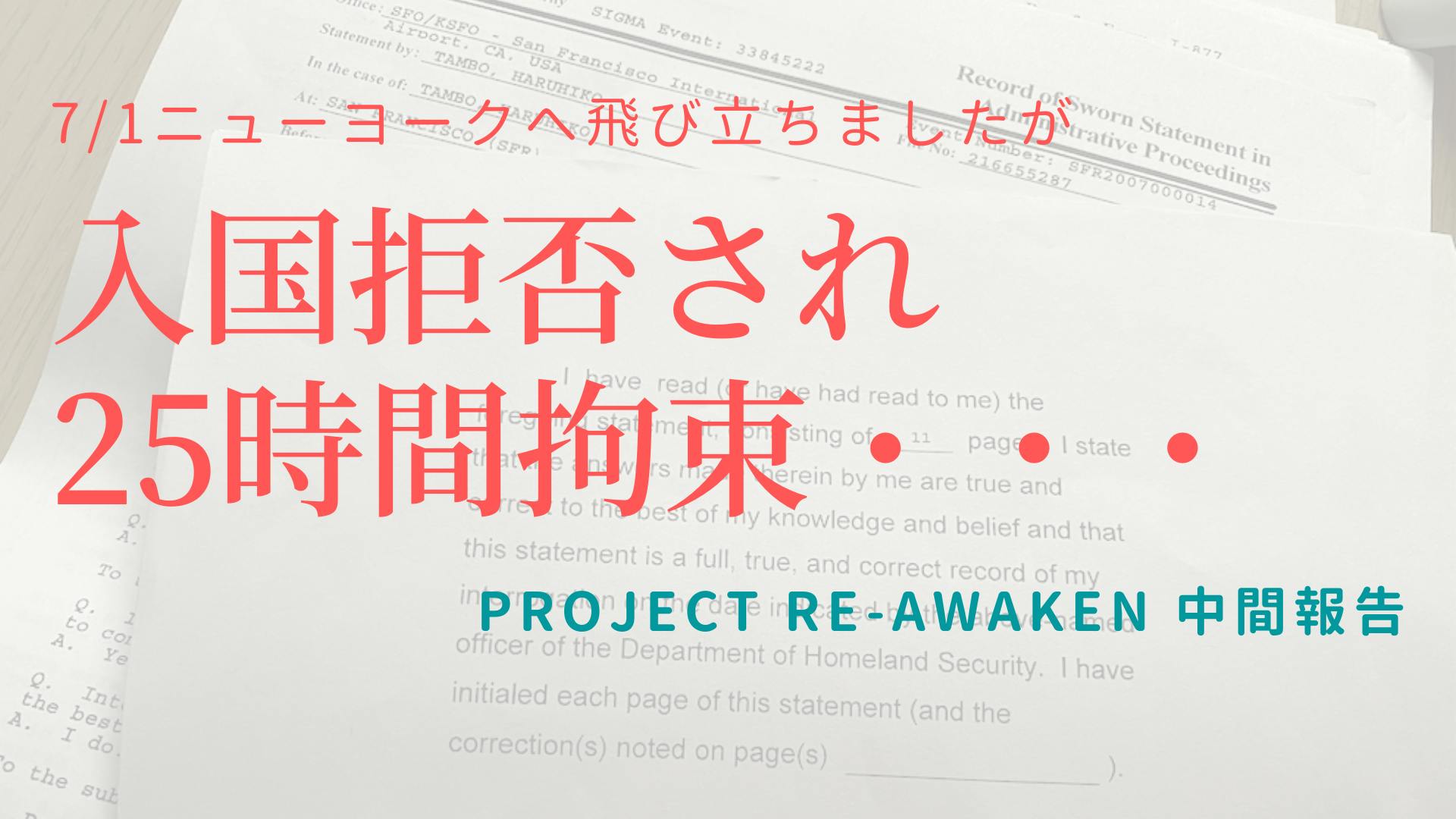 2020/07/21 13:01こんにちは、Re-awakenの丹保晴彦です。プロジェクトへのご支援ありがとうございました。7月1日、プロジェクトの活動第1弾として、ニューヨークへ向けて渡航しました。しかし、結果は入国拒否で東京へとんぼ返り。応援してくださっている方々には、本当に申し訳ない気持ちです。COVID-19(新型コロナウイルス)や I can't breathの暴動の影響で、入国時の審査官による取り調べが、かなり厳しくなっていました。サンフランシスコの空港で取り調べのために25時間拘束され、ESTAでの短期渡航ではRe-awakenの活動目的での入国が不可、という判断を下されてしまいました。詳細なご報告内容を、Youtube動画にまとめましたので、より詳しい内容は、記事下の動画をご覧ください。今後は、日本の米国大使館で、B-ビザ(ビジネス目的ビザ)の取得を試みつつ、東京に滞在して、国内で実行できる活動から進めて参ります。引き続きどうぞよろしくお願いいたします。 もっと見る