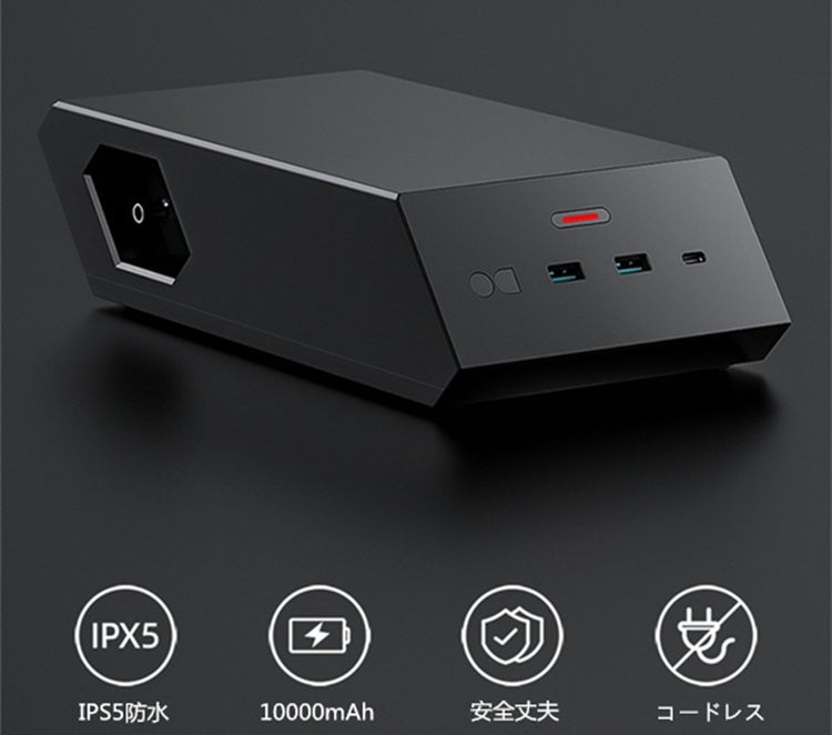 ポリマー芯を使用、内蔵大容量10,000mAhバッテリー、サイクルの回数は約600回以上。外側は高強度ポリカーボネートを採用で、防水、防火の安全性を持ちます。