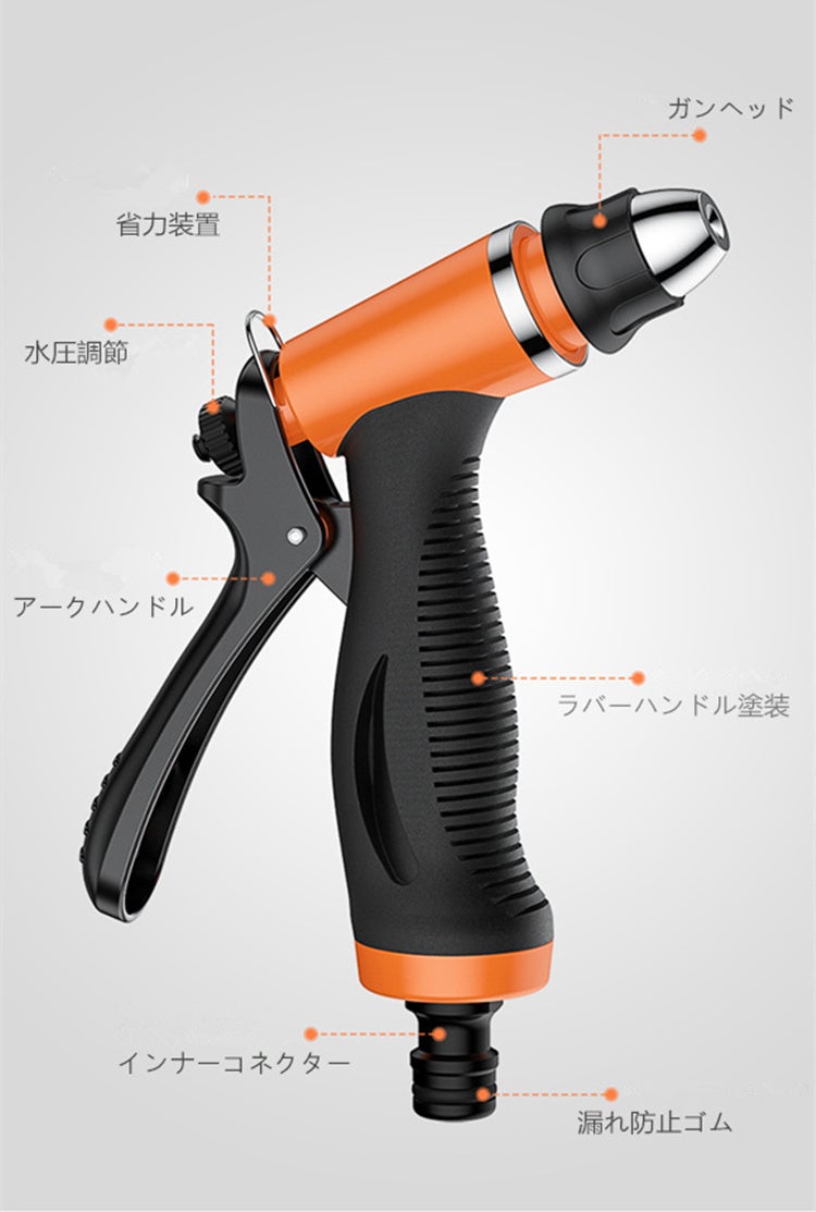 握り心地がいい滑り止めのラッパーハンドル塗装仕様。ノズルスプレーガンを回転させ、水の流れをミスト、散乱、直線に変えます。