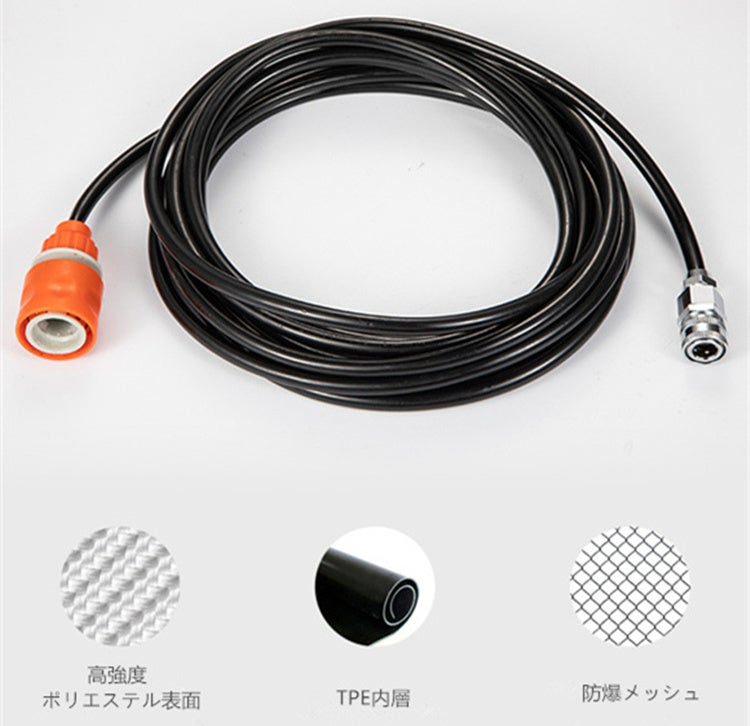 出水ホースは厳選な高強度ポリエステル、TPE、防爆メッシュを採用、収納しやすく絡みにくいため収納も楽々です。