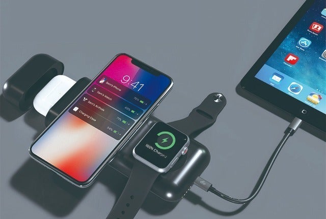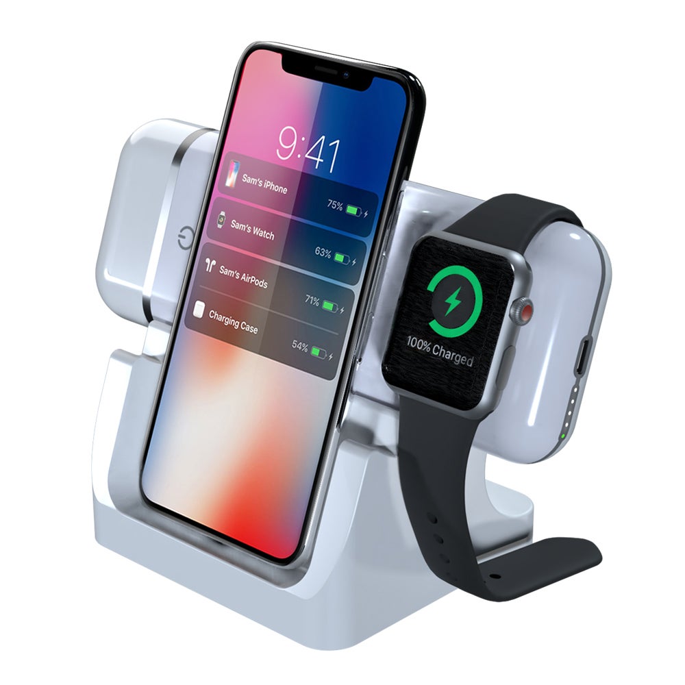 Appleデバイスに調和するようデザインされたボディに、Qi対応ワイヤレスチャージャー、Apple Watch専用ワイヤレスチャージャー、AirPodsをそのまま収納・充電できるスペースを搭載。有線充電が可能なUSB-C端子まで、最大4台のデバイスに一括で給電できるスマートなバッテリーです。