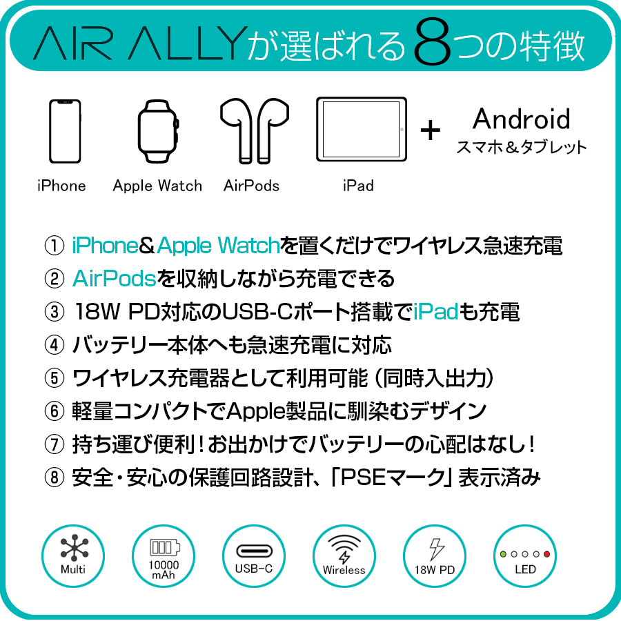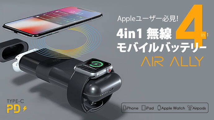 AirAlly(エアーアリー)は、iPhone、iPad、Apple Watch、Air podsなどのApple製品を最大4台同時に充電できる10000mAh大容量モバイルバッテリーです。