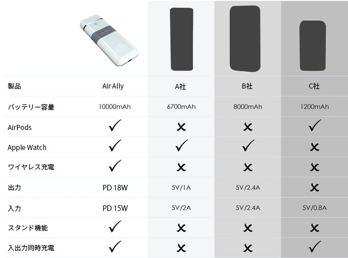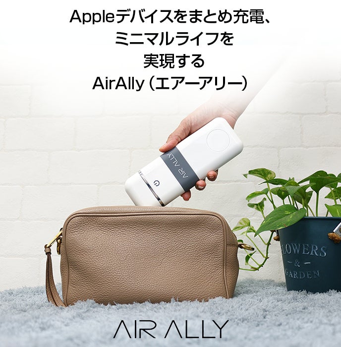 AirAlly(エアーアリー)は、iPhone、iPad、Apple Watch、Air podsなどのApple製品を最大4台同時に充電できる10000mAh大容量モバイルバッテリーです。