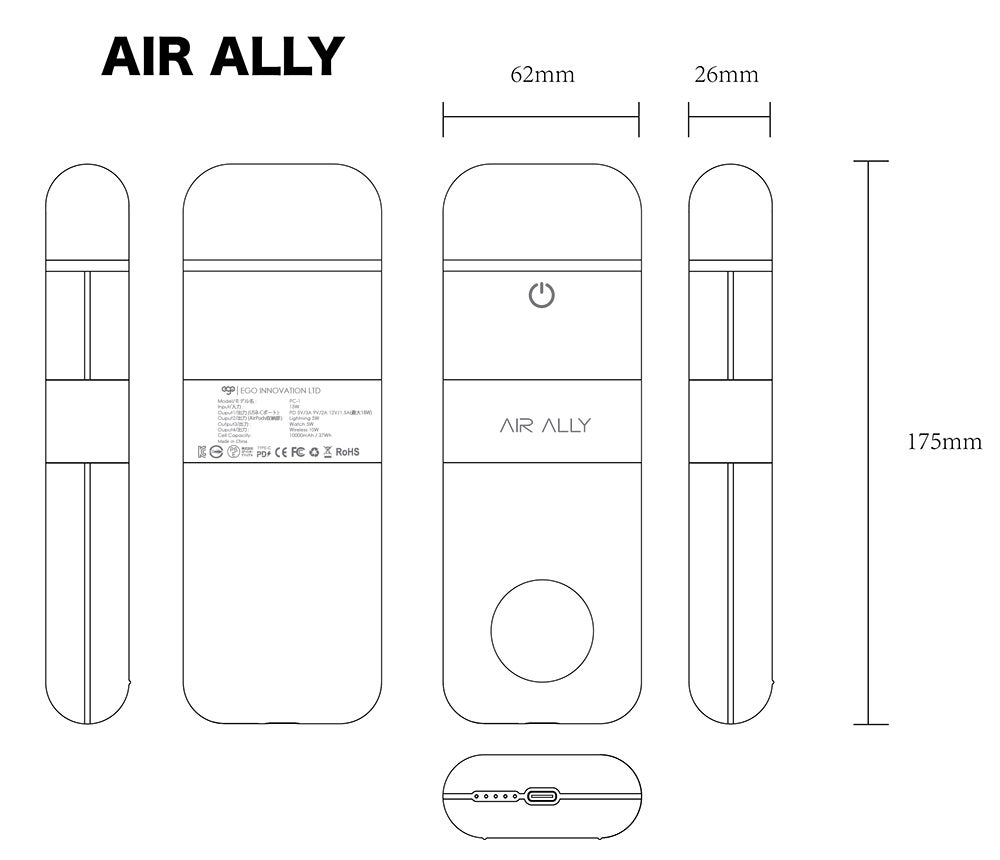 AirAllyは、過熱・ショート・過充電に対する複数の保護回路設計がなされており、安全にお使いいただけます。 日本国内の安全基準に則って製造・輸入された事を示す「PSEマーク」を表示済みのものをお送りさせていただくので安心してお使いいただけます。