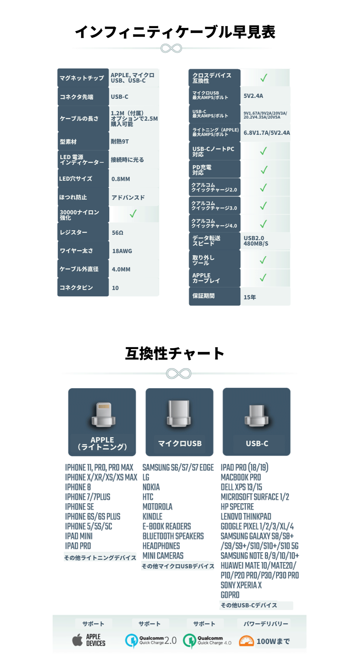 世界で初めて100W USB-C PDに対応し、3つのメジャーなUSBタイプとのクロスデバイス互換、全ての携帯電話やタブレット、ノート型パソコンを含めるUSB-C PDデバイスとの互換性もあります。インフィニティケーブルは世界初の真にユニバーサルなUSBケーブルです。