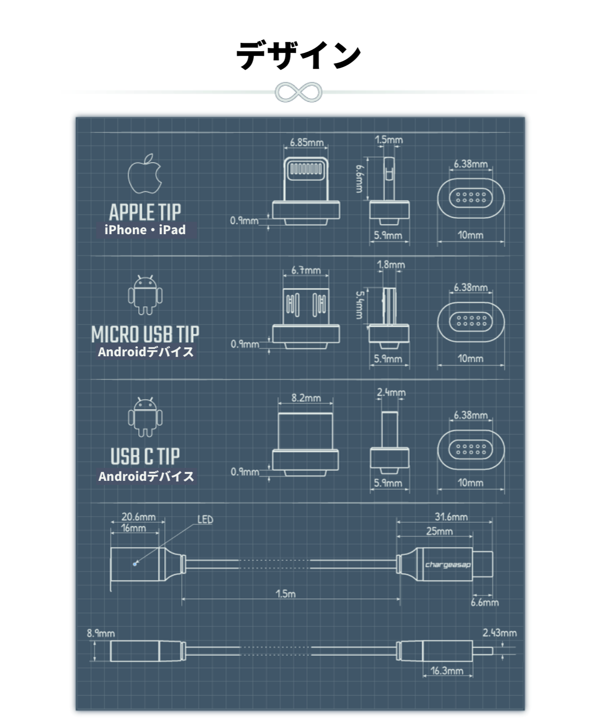 新しいケーブルでは磁力をアップグレードしました。また革新的なロック機能を組み込むことにより、より一層強い接続と寿命をもたらします。また、このより強い磁力は、より長いケーブルの使用も可能にします。各ケーブルセットは1.2mのケーブルが付属しオプショナルで2mのケーブルも購入可能です。ケーブルも30,000回から40,000回接続できるよう改造。あなたのデバイスより長生きする…かもしれません。