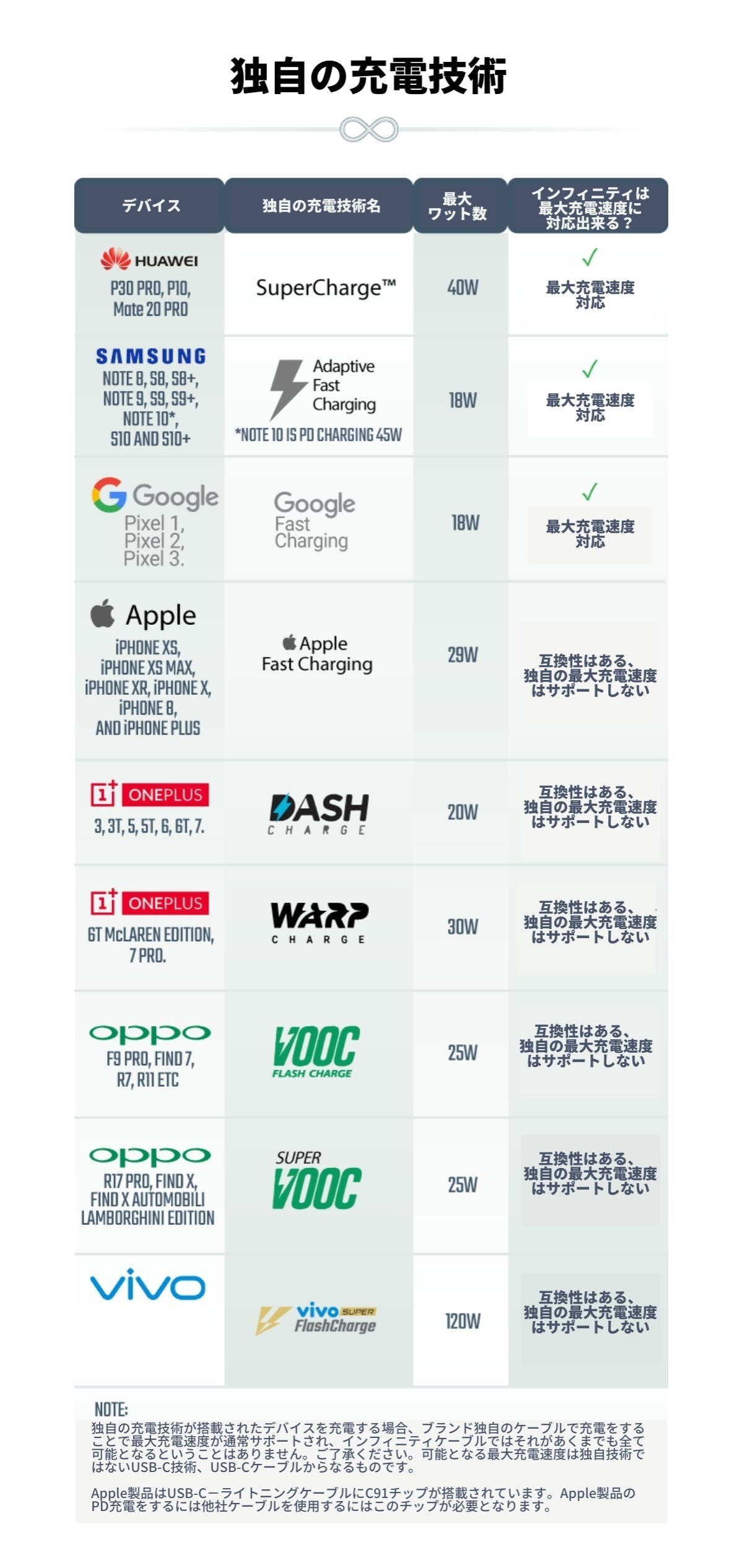 上の一覧表をご覧になり、自分の携帯電話を第三者の独自ので充電技術で充電してもなお、売りにしている機能を活用できるのか確認してみてください。最速充電は同じ会社の同じ機器を使用しないと互換性がありません。インフィニティを使うと、そんな独自の充電技術に統合することなく最速充電を可能にします。