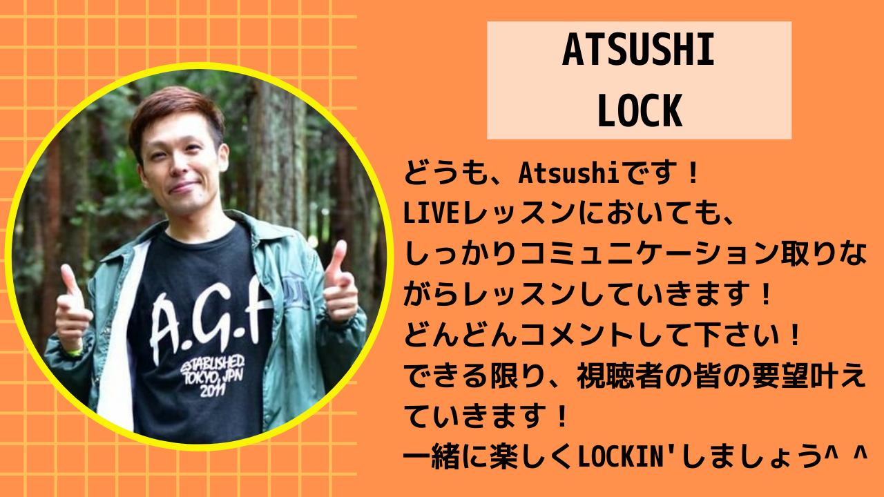 日本を代表するLOCKチーム『3 KICK SPLITS』『ALL GOOD FUNK』で数々の実績を誇るLockダンサーATSUSHI先生がLIVEレッスンをしてくれます!