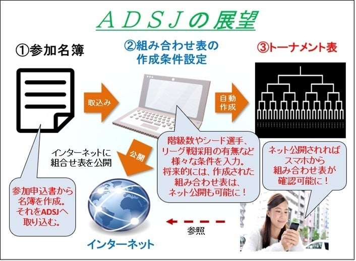 実際に子供たちを指導されている先生方や有識者、各種大会運営者など約30名の方々にアンケート調査を行い、育成型自動抽選システム(ADSJ)に必要な条件を抽出し、今回は基本機能に絞って開発を行うことにしました。