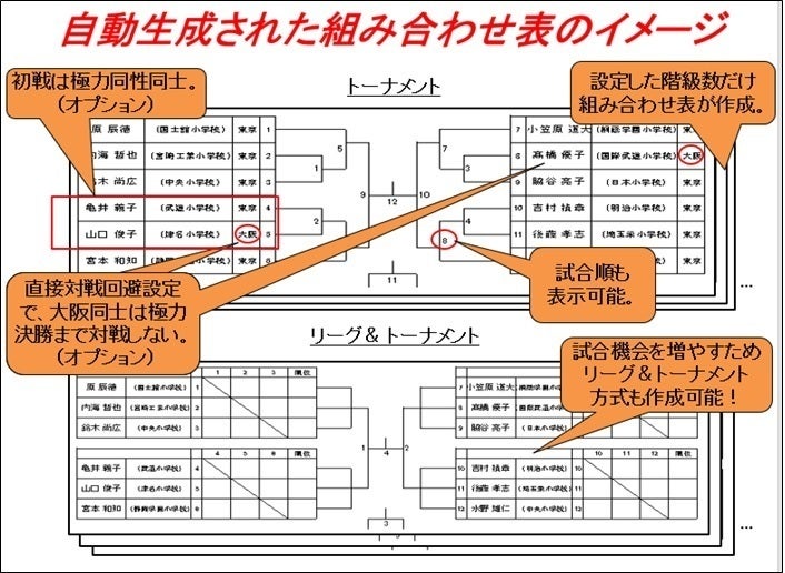 具体的には参加名簿を取込み、作成条件を設定し、トーナメント表作成ボタンを押すと、各階級の人数を均等に配分し、ランダム抽選を行ったトーナメント表が自動的に出来上がります。