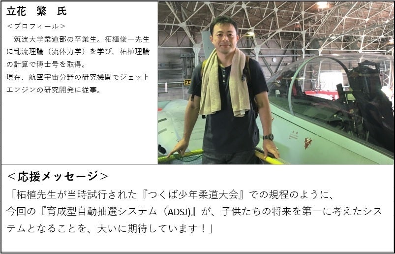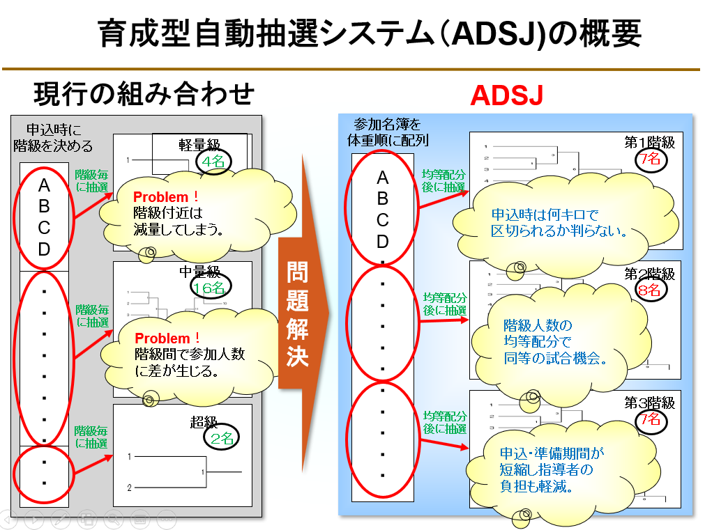 今回の「育成型自動抽選システム(ADSJ)」は、東大柔道部のご出身で、私の大学院時代の恩師、筑波大学名誉教授の柘植俊一先生が、子供たちの将来を第一に考えて提唱されていた「体重順個人戦」が原点です。