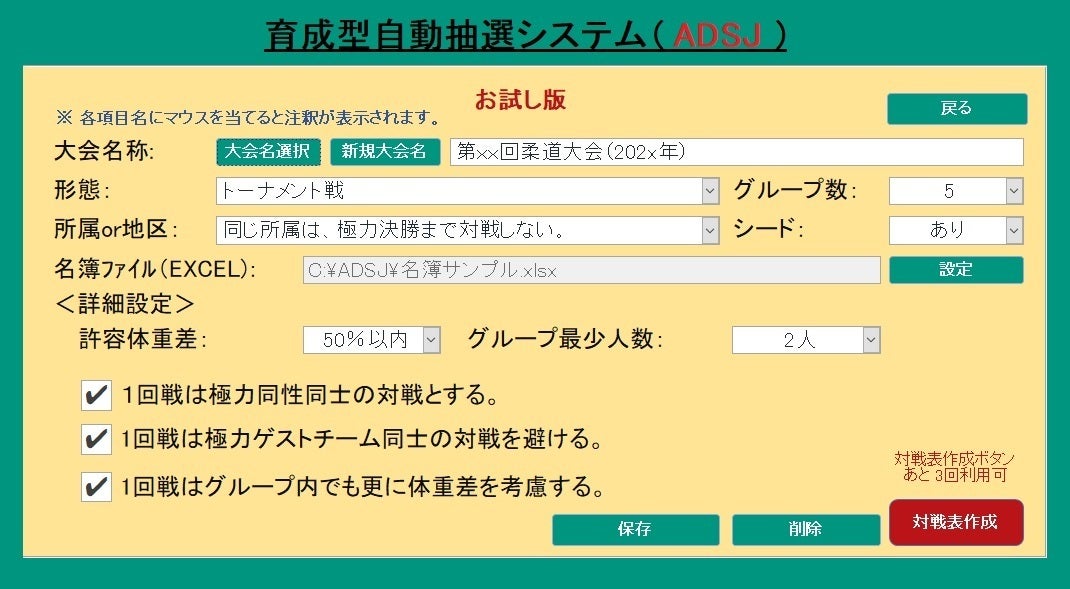 これらの問題を解決すべく、参加申込表から、各階級の人数を均等に配分する組み合わせ表を、自動生成するシステム「育成型自動抽選システム(ADSJ)」を作り、子供たちにも保護者にも、そして大会を運営する側の方々にも、是非喜んでいただきたいと思っています!