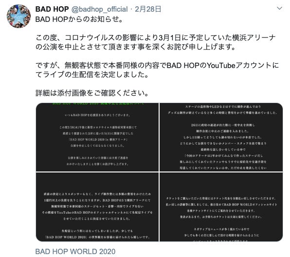 先日私たちは、3/1 横浜アリーナにて開催を予定しておりました「BAD HOP WORLD 2020」を昨今の情勢を考慮した結果止むを得ず公演を中止することにしました。