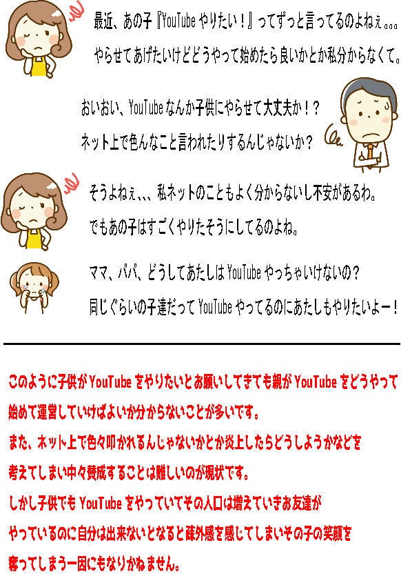 しかし子供が憧れる反面、親はYouTubeをやりたいと子供に言われてもどうやったら良いか分からないや心配といった声があります。